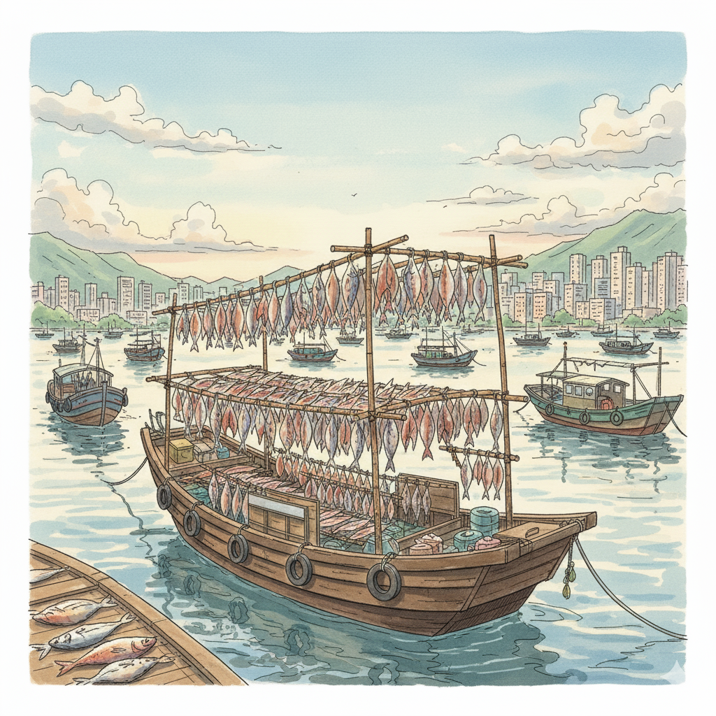 隱藏瑰寶: 今天,當你乘著舢舨遊覽避風塘時,請務必留意尋找一件「活態文物」——儘管避風塘內仍停泊著不少曬家船的船體,但據記載,真正仍在船上曬製鹹魚和魷魚的,僅存一艘。它靜靜地泊在水上,是昔日繁盛漁獲加工業的最後見證。同時,那碗仍在販賣的艇仔粉,則是當年流動餐飲文化留下的、最能触動味蕾的遺存。