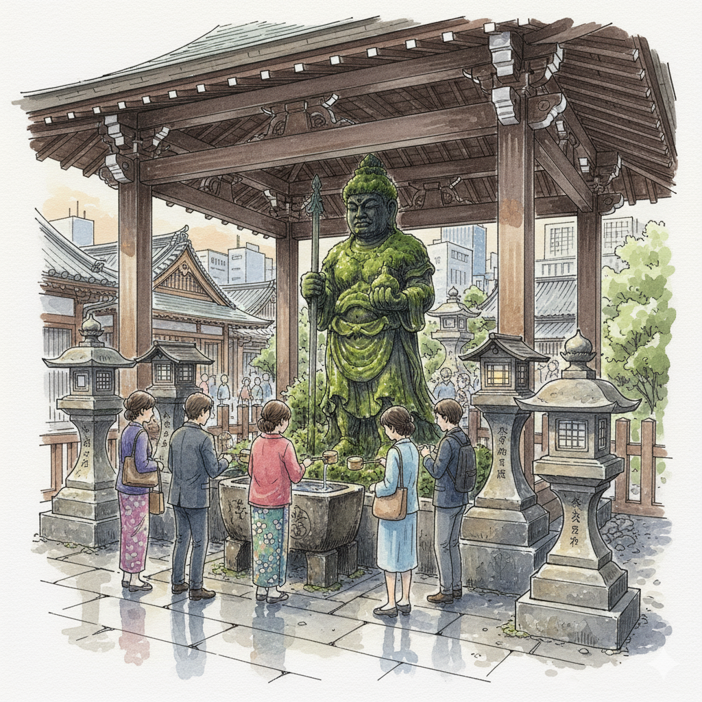 Over decades and centuries, this constant ritual of devotion has produced something extraordinary. The hidden gem is the Mizukake Fudo Son (水掛不動尊), a statue whose most striking feature is not its carved stone, but the thick, vibrant coat of living moss that completely envelops it. This verdant layer is the beautiful, tangible result of accumulated time and countless prayers. In a city defined by commerce, this icon stands as a powerful symbol of enduring faith.