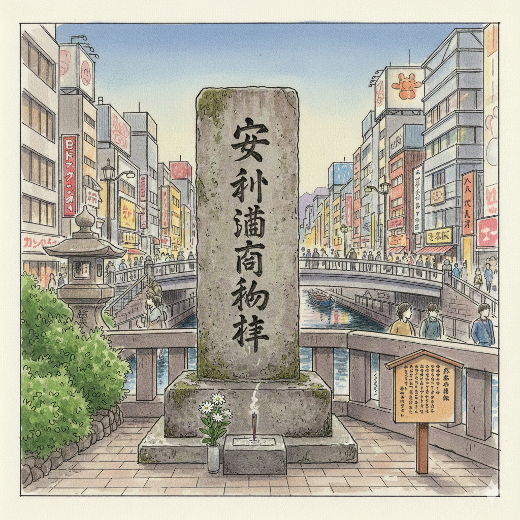 En el extremo oriental del bullicio, a menudo ignorado por los transeúntes apresurados, se encuentra el origen tangible de todo. Busca el Monumento a Yasui Doton-ō en Nihonbashi Kitazume Higashi. Esta discreta estela de piedra no es solo un marcador histórico; es el punto cero del alma comercial de Osaka, un lugar para presentar respetos al hombre cuya sangre y tesoro dieron vida a este distrito.